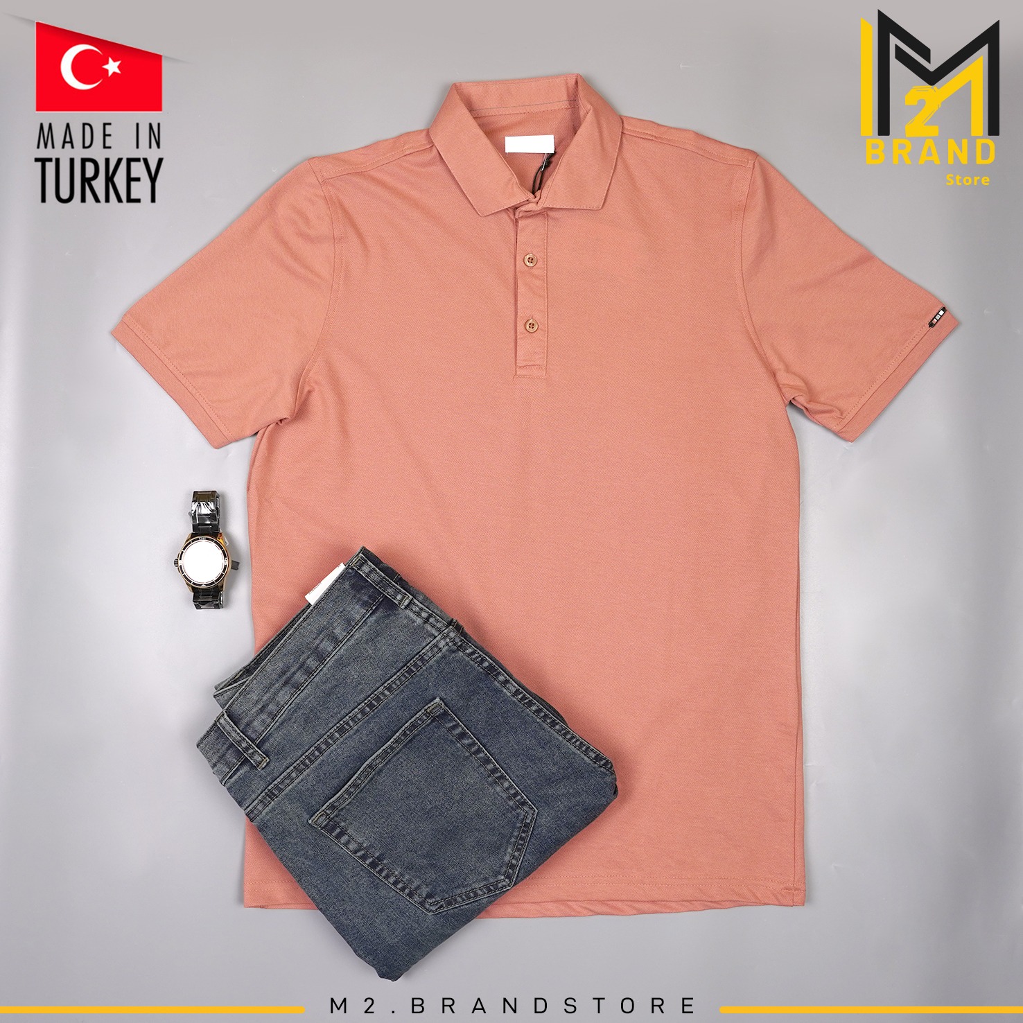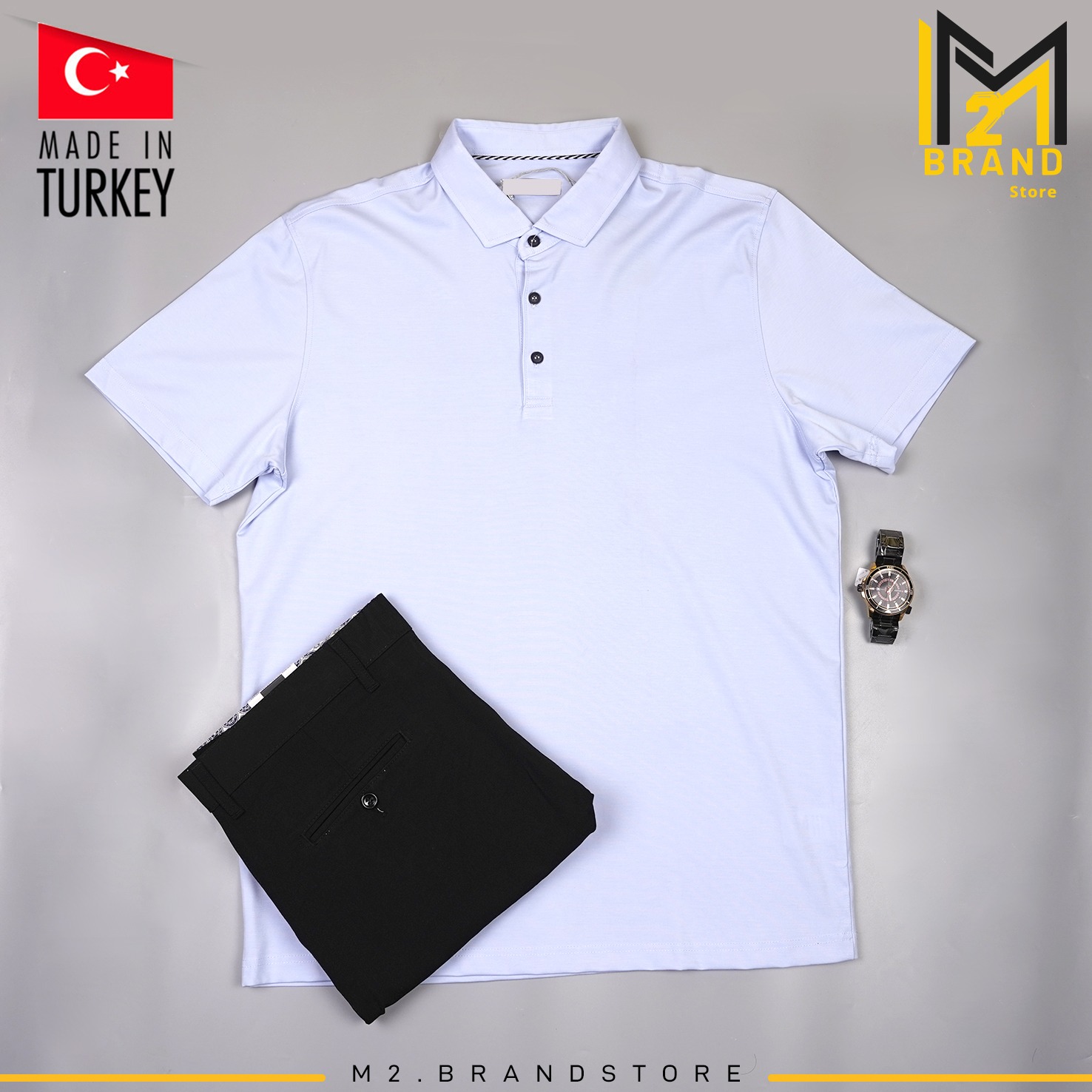 تيشيرت رجالي بنظام قميص: بياقة كلاسيكية وأزرار أمامية، بخامة ناعمة بلمعة خفيفة تعطيك إحساس الساتان، مزيج بين الرسمية والكاجوال.