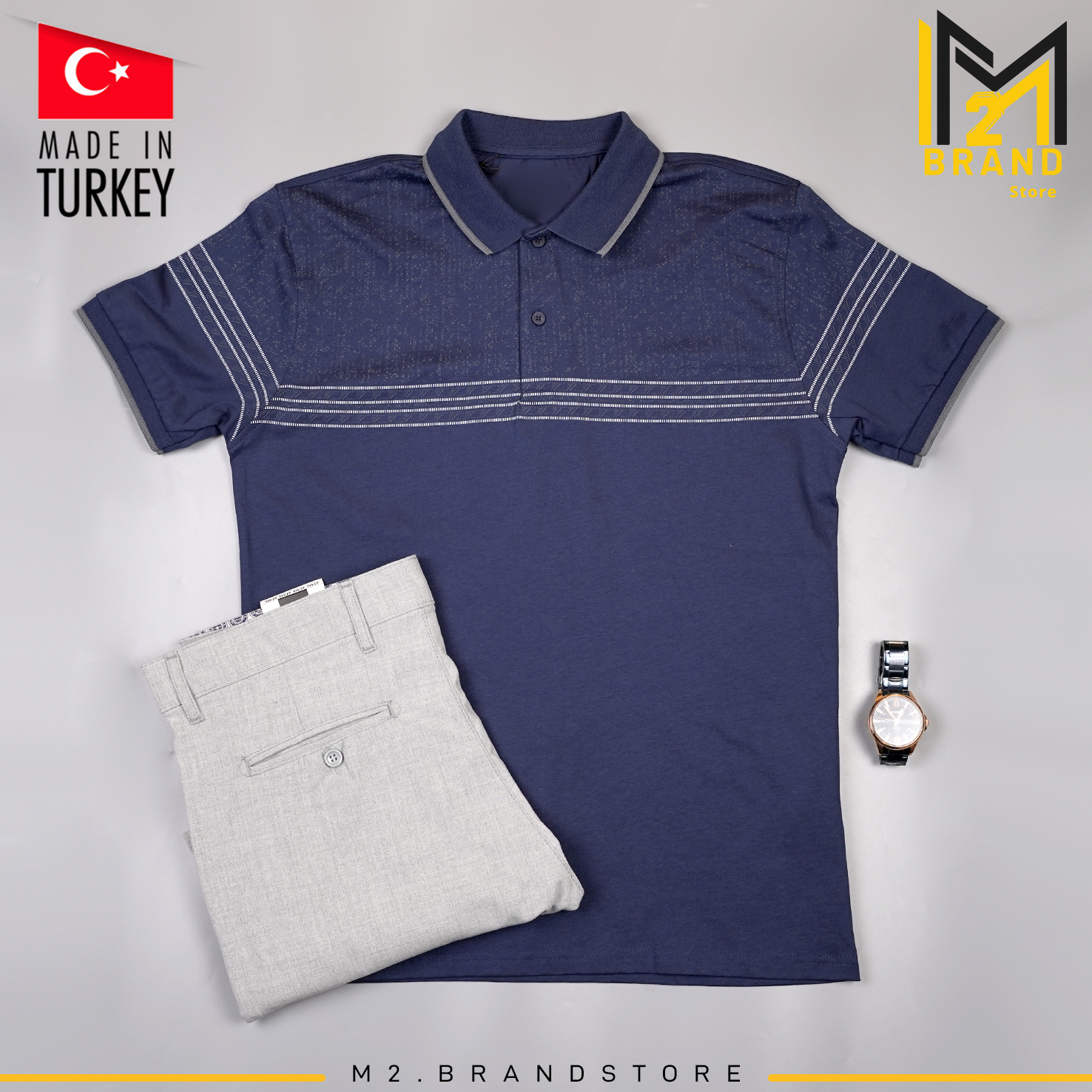 يتكوّن من تيشيرت بولو بلون كحلي عميق، مزخرف بخطوط رمادية تضيف لمسة عصرية وراقية، ومصنوع من خامة ناعمة مريحة مناسبة لأيام الصيف أو الطلعات اليومية.